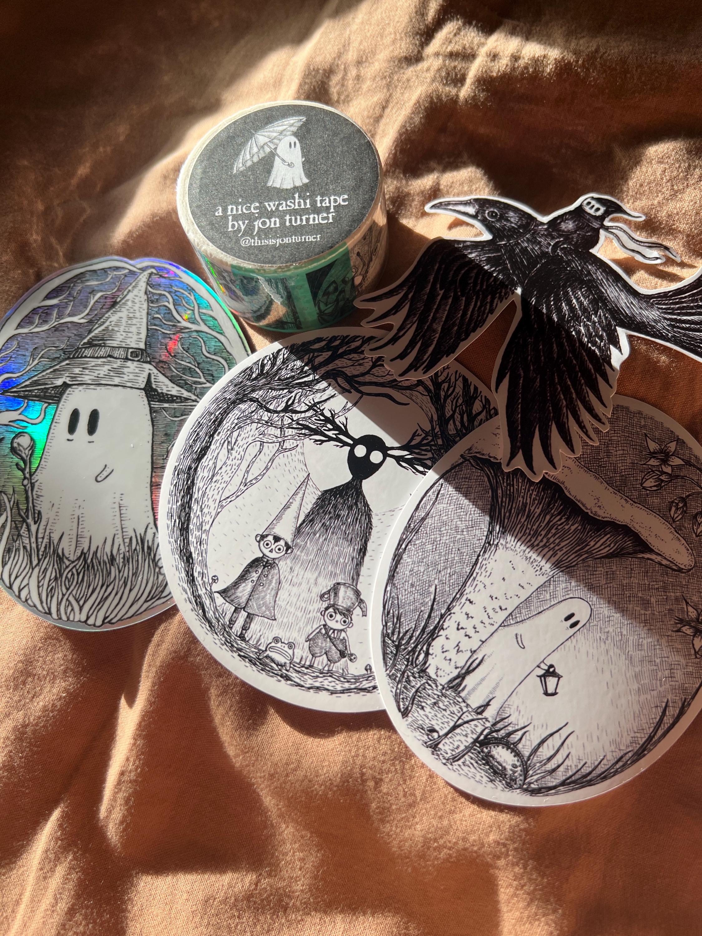 A little ghost creeping through the undergrowth, to add some spooky charm to your laptop, water bottle, or any other surface, from original pen and ink artwork by Jon Turner.