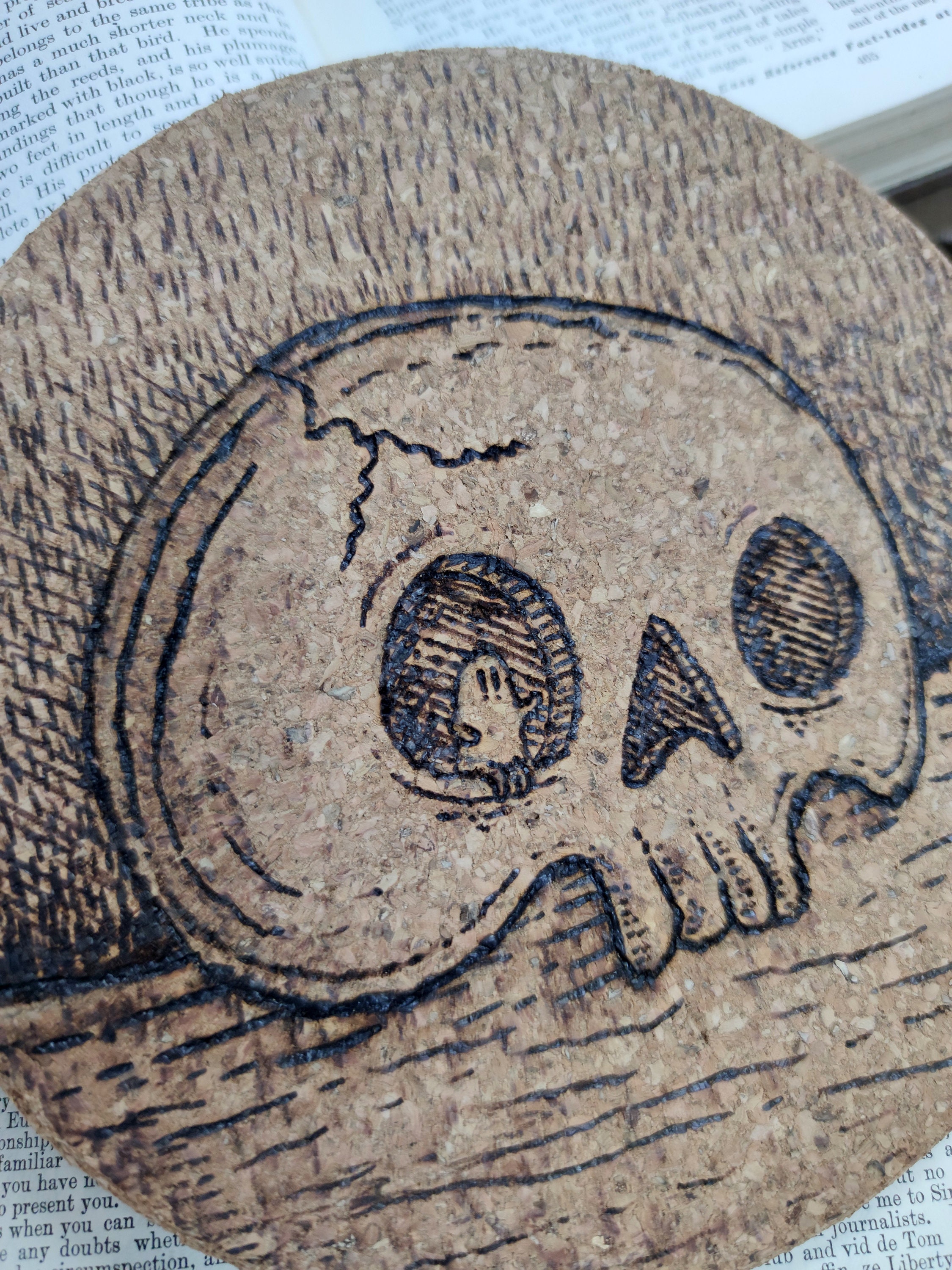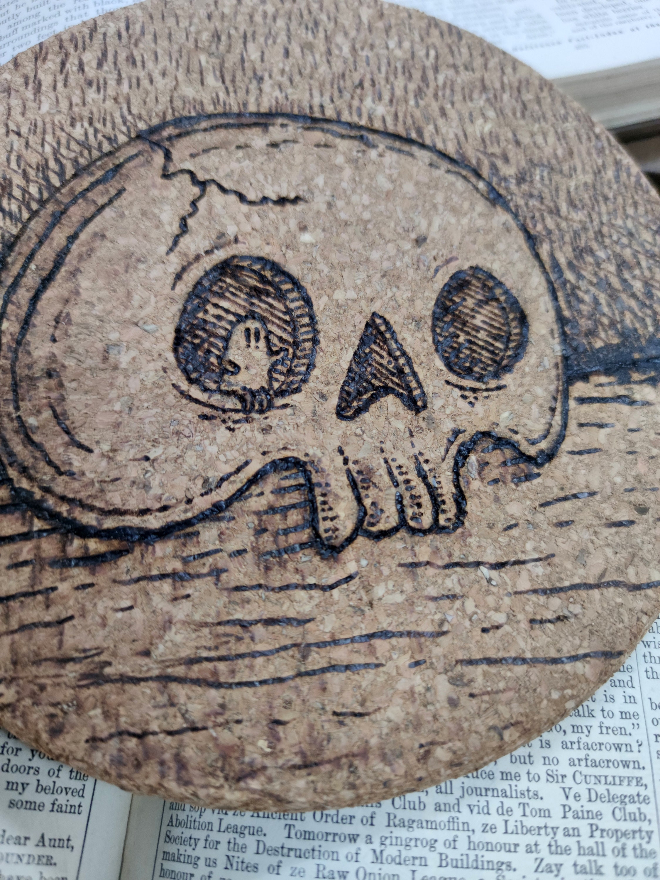 A one-of-a-kind piece of pyrography, burned freehand onto a circular cork panel, featuring a tiny ghost sitting in a spooky skull. Signed pyrographically to the reverse, with a sawtooth hanger attached so that you can hang it on the wall (or you can use a plate stand if you'd like it on a shelf).