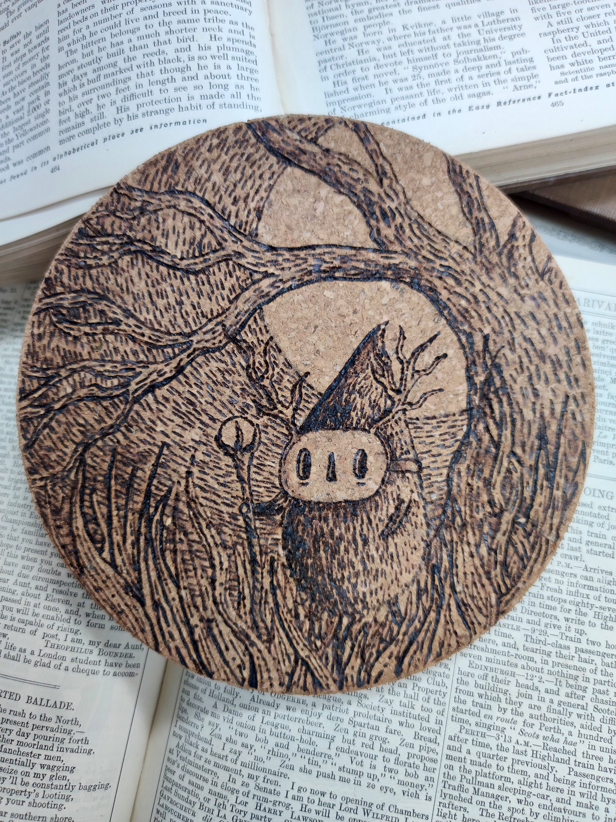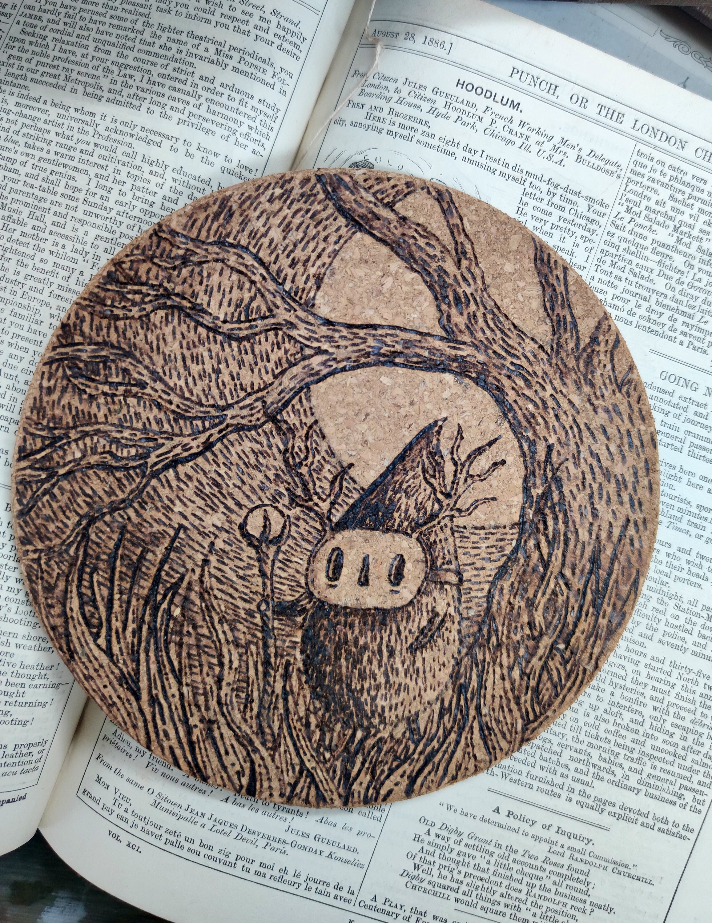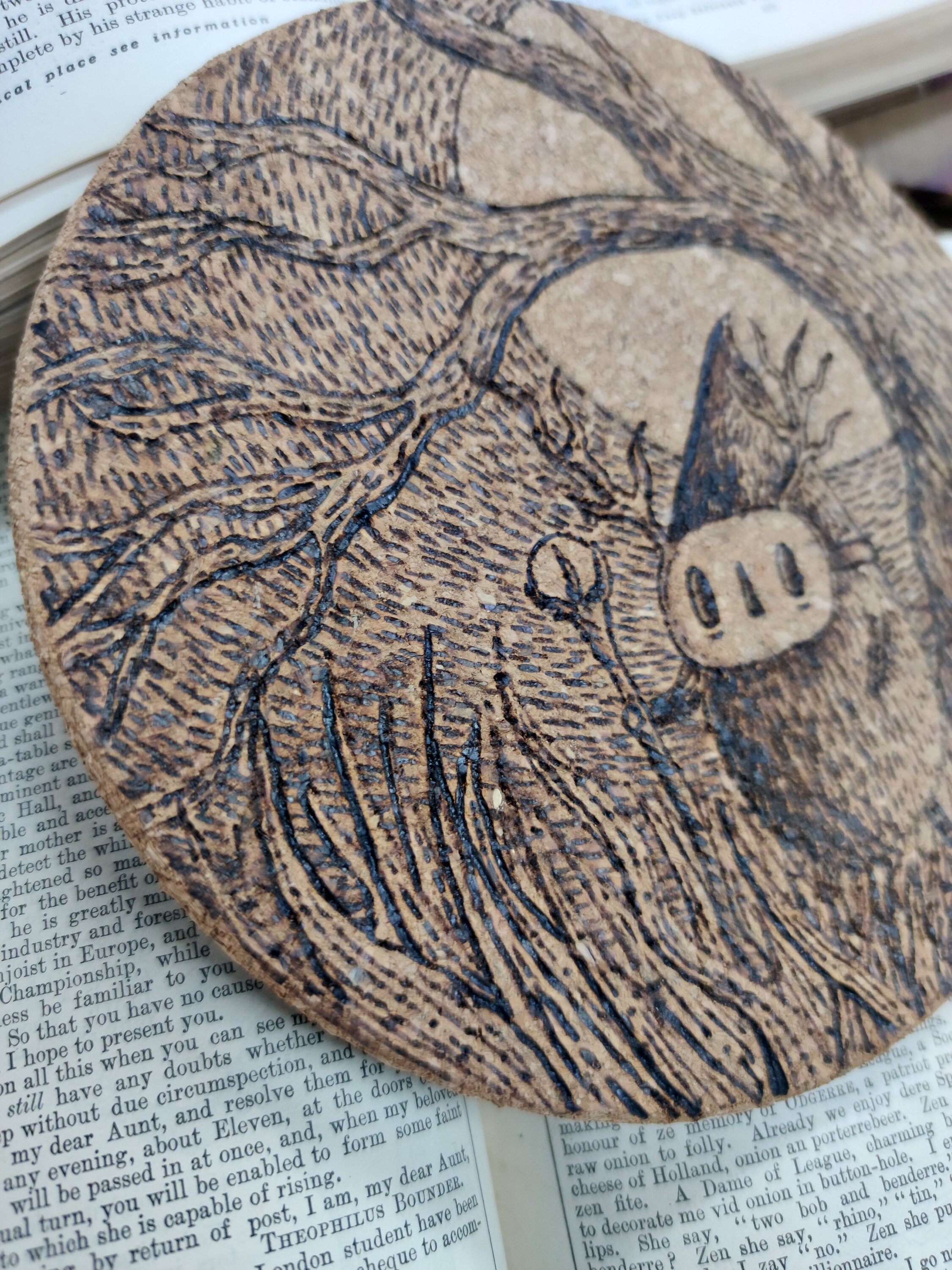 A one-of-a-kind piece of pyrography, burned freehand onto a circular cork panel, featuring a little magical woodland spirit on a moonlit night. Signed pyrographically to the reverse, with a sawtooth hanger attached so that you can hang it on the wall (or you can use a plate stand if you'd like it on a shelf).