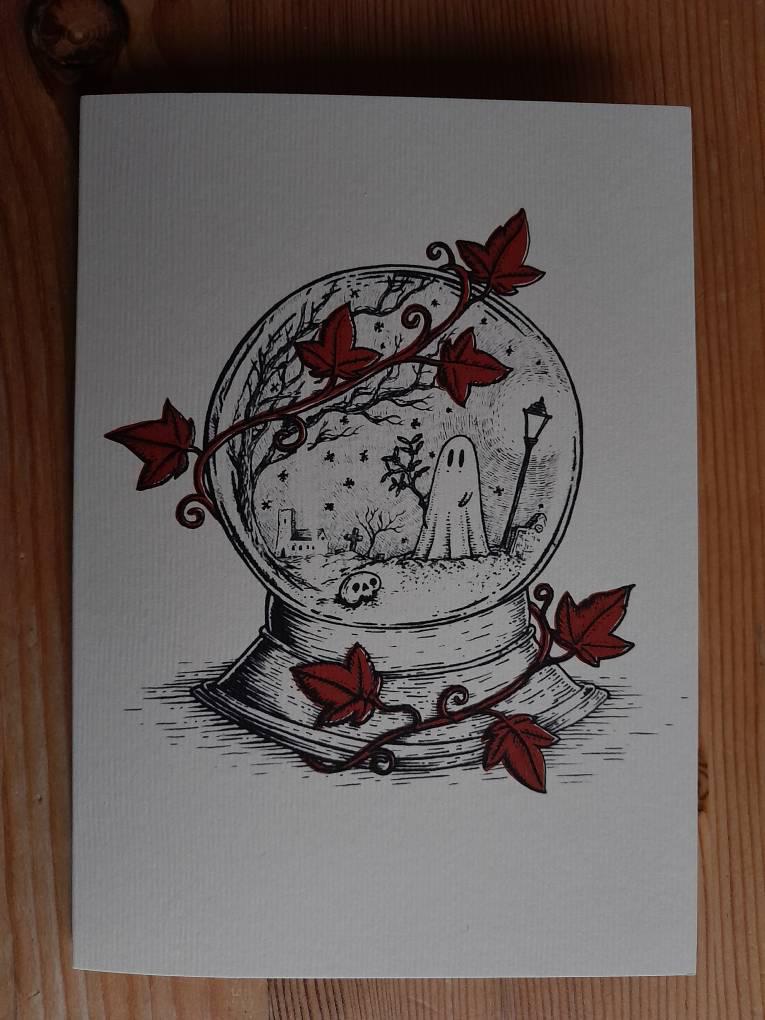 A little festive ghostie wandering in a spooky snowglobe.