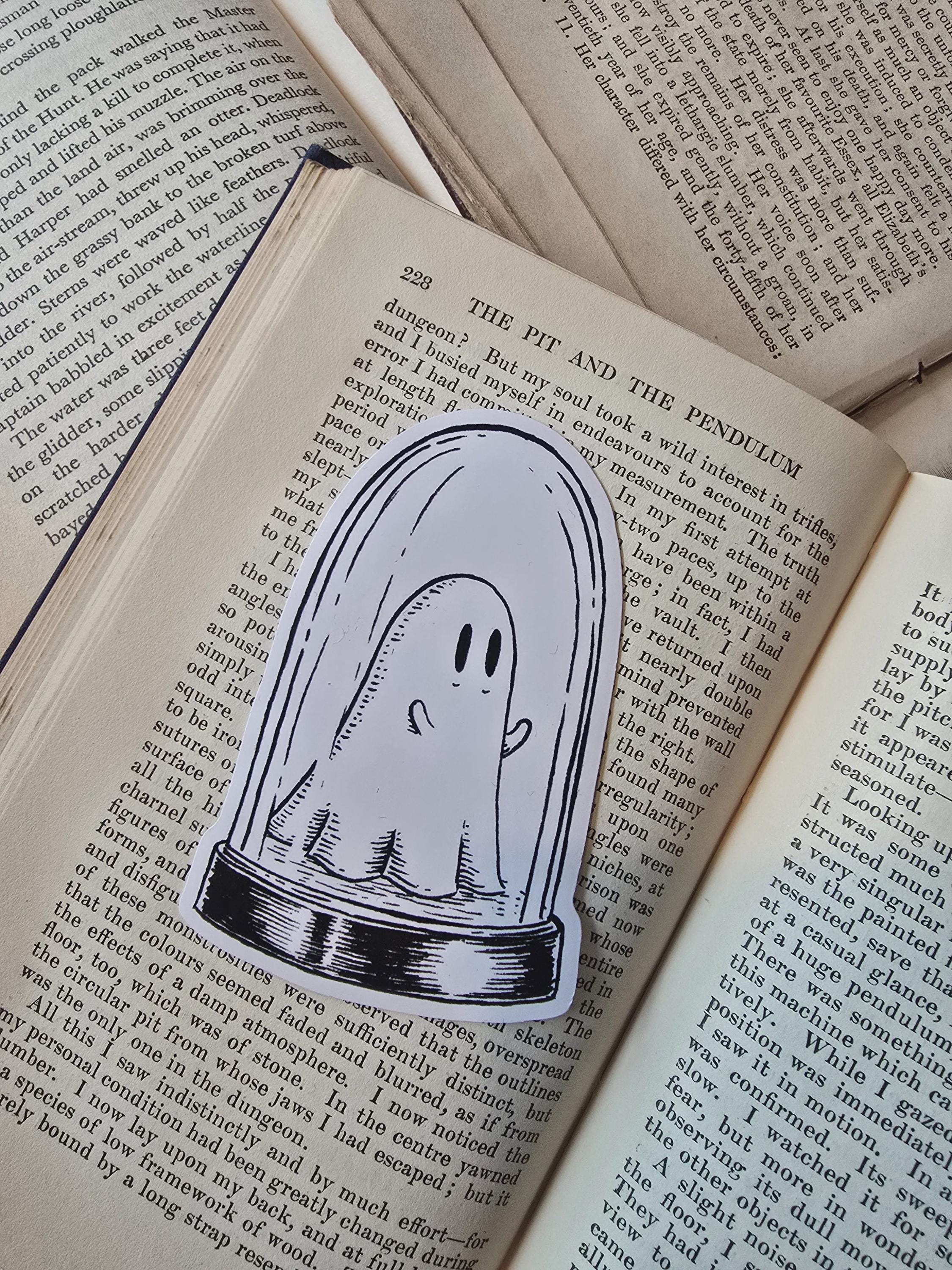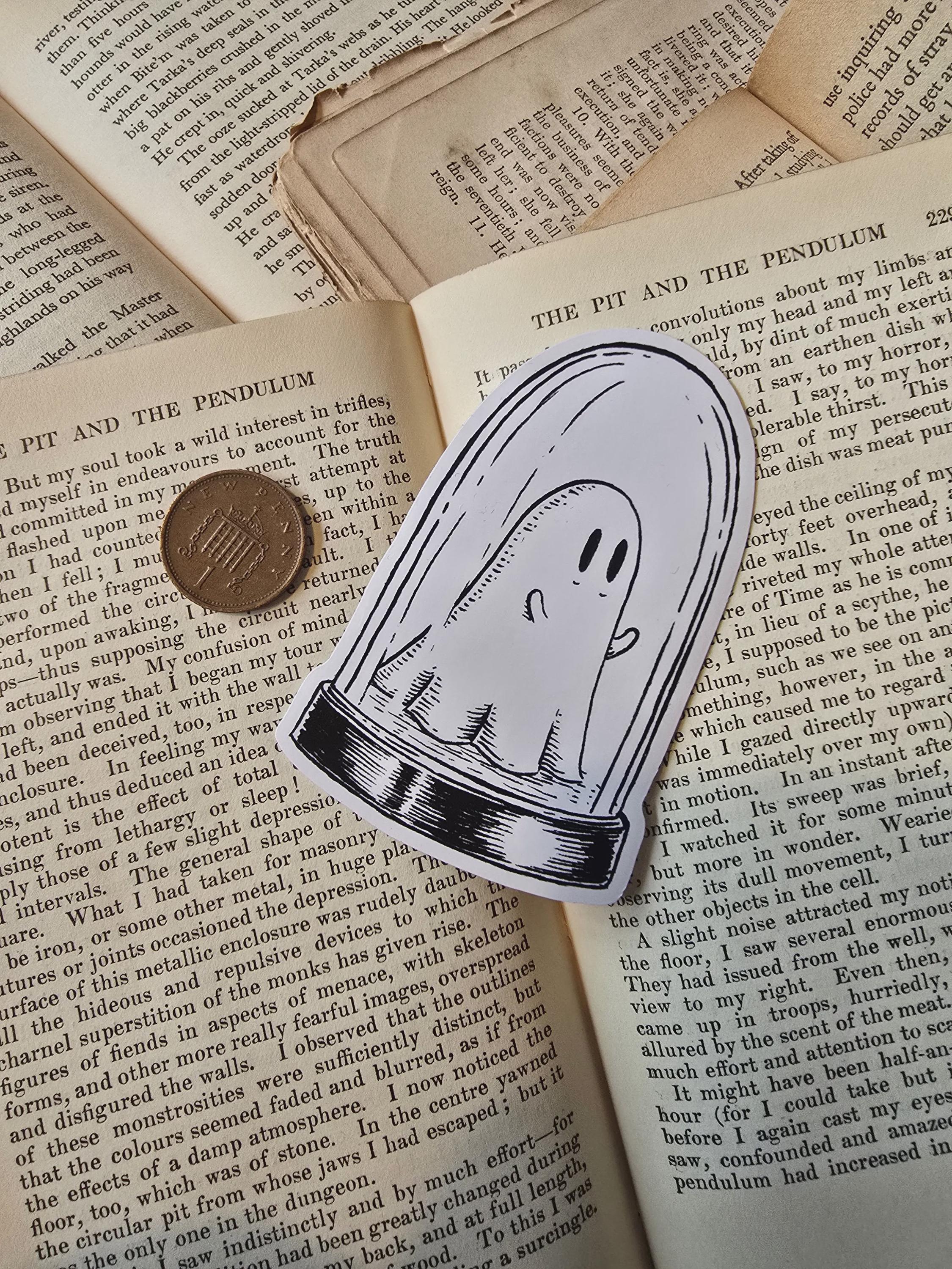 An adorable little ghostie caught in a bell jar, from original artwork by Jon Turner. A die-cut vinyl sticker, suitable for interior or exterior use.