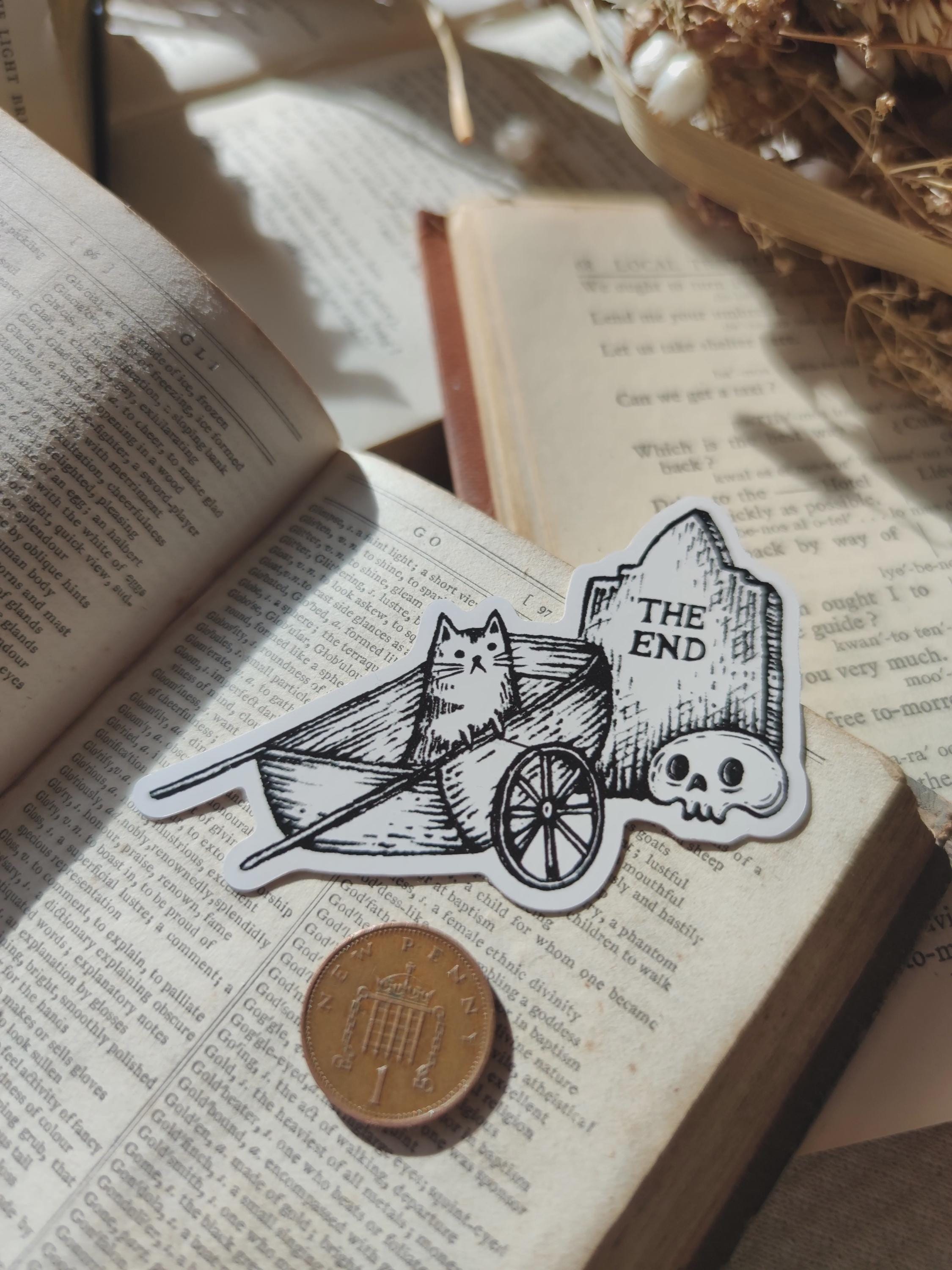 An adorable little cat sitting by a spooky grave, from my original pen and ink artwork, here printed on a high quality die-cut vinyl sticker, suitable for interior or exterior use. Perfect for any a touch of finality to any surface.