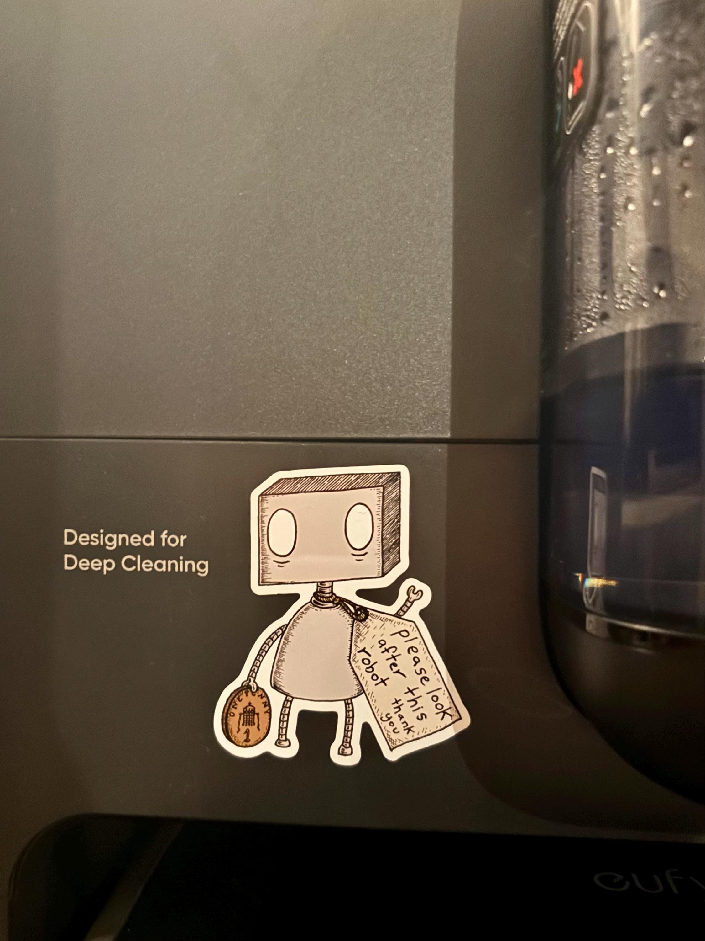 A sticker featuring a little robot to take care of, from original pen and ink artwork by Jon Turner.