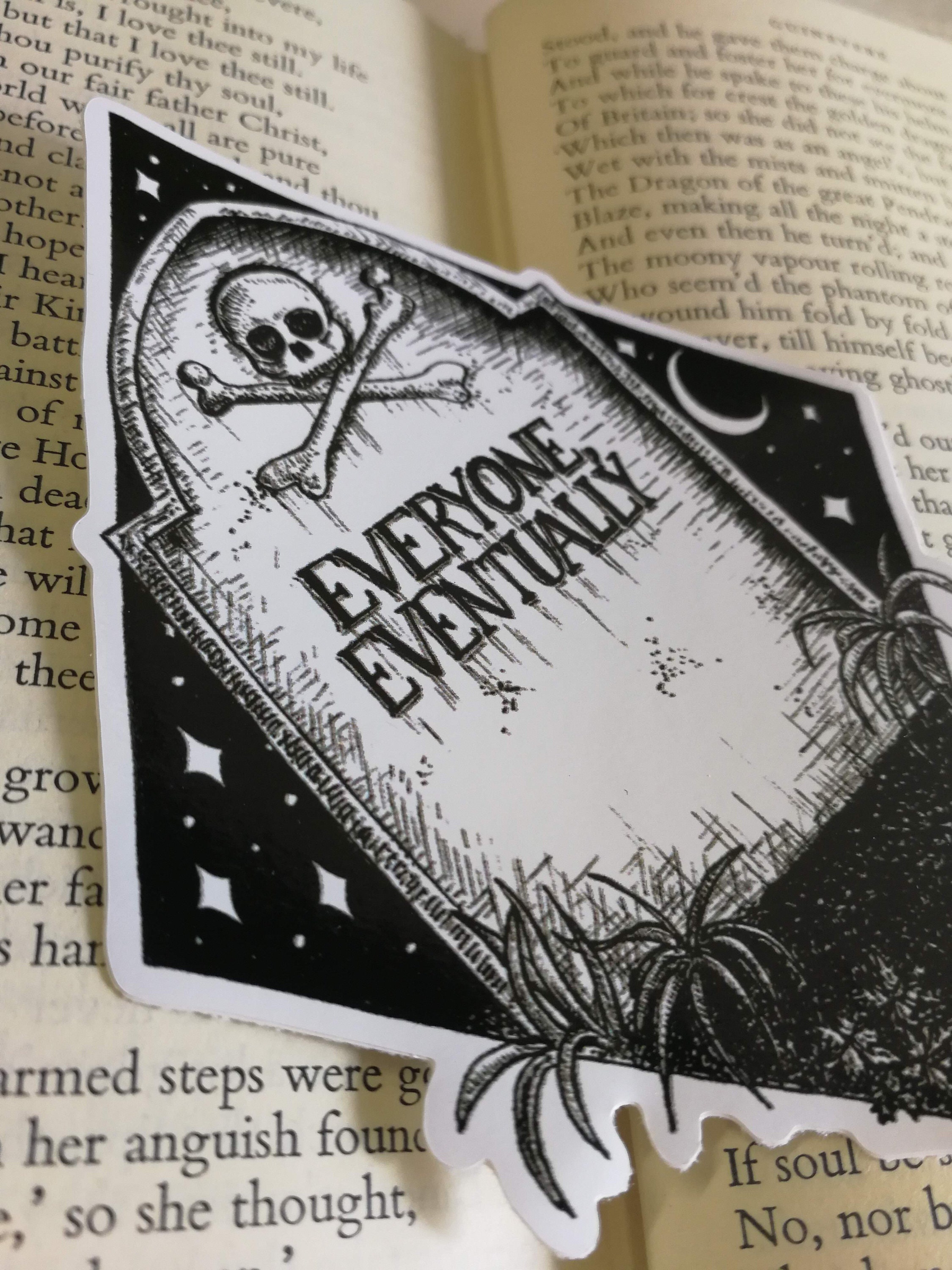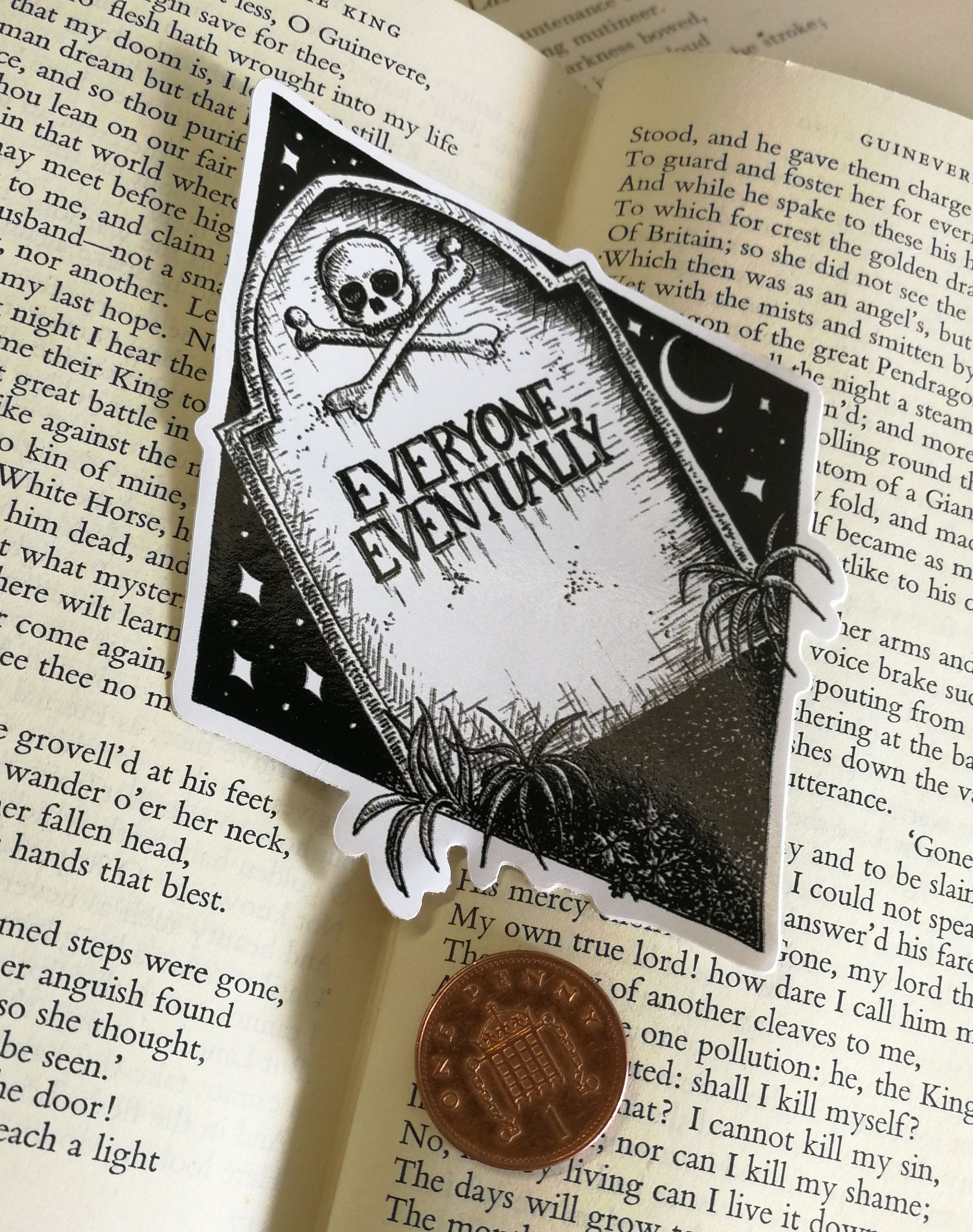 A little memento mori for your laptop, phone, or wherever you want to stick it. From original pen and ink artwork by Jon Turner.