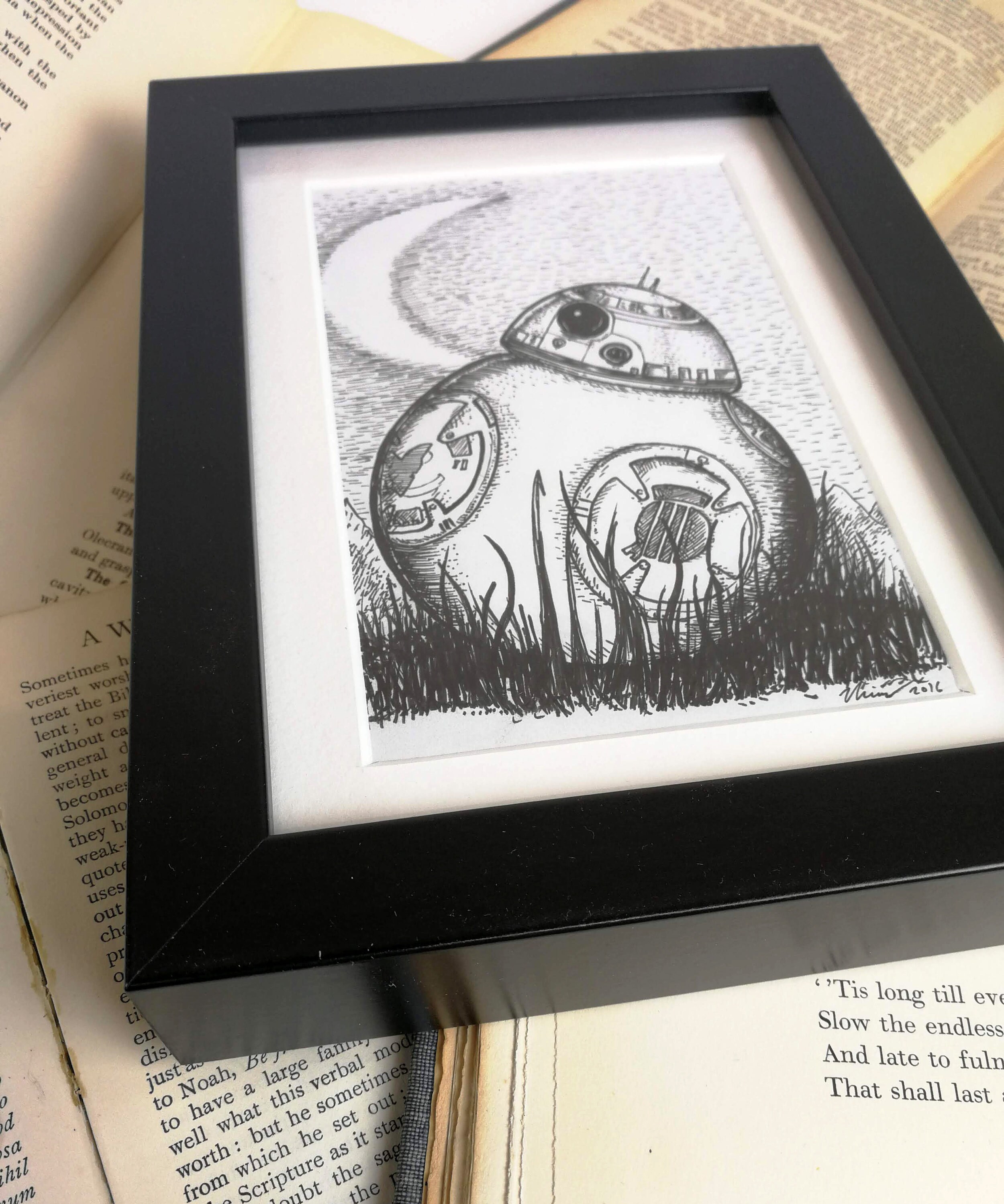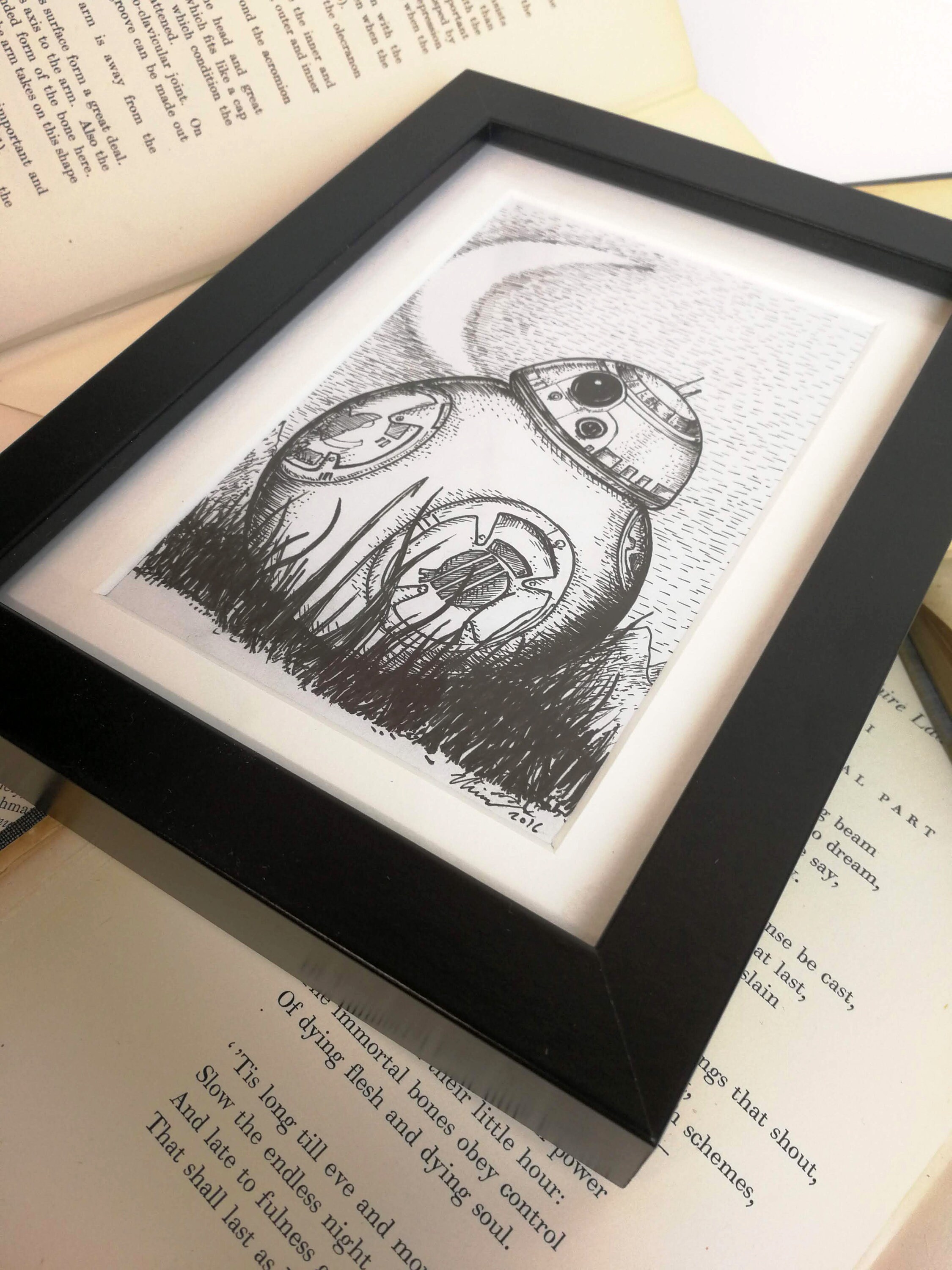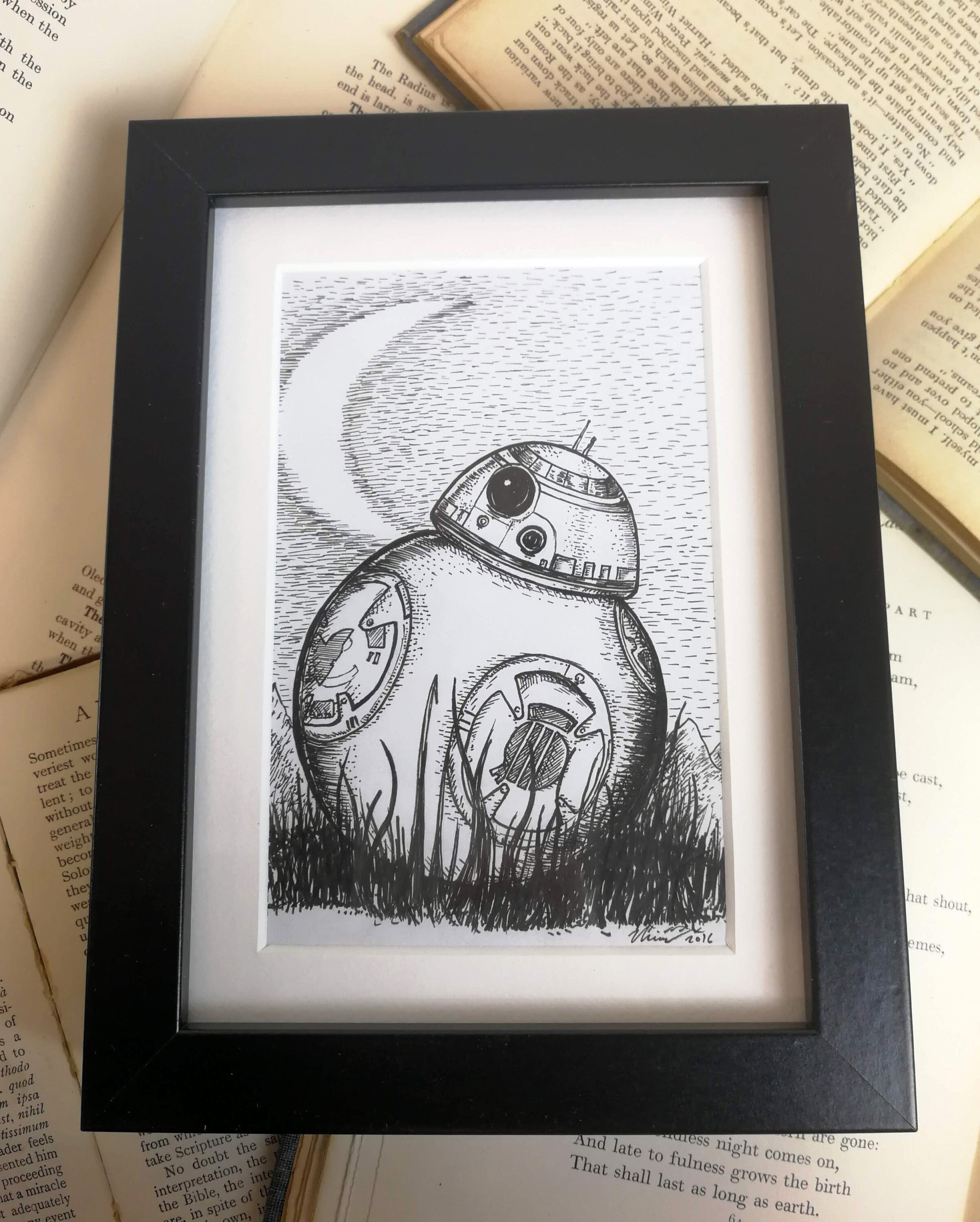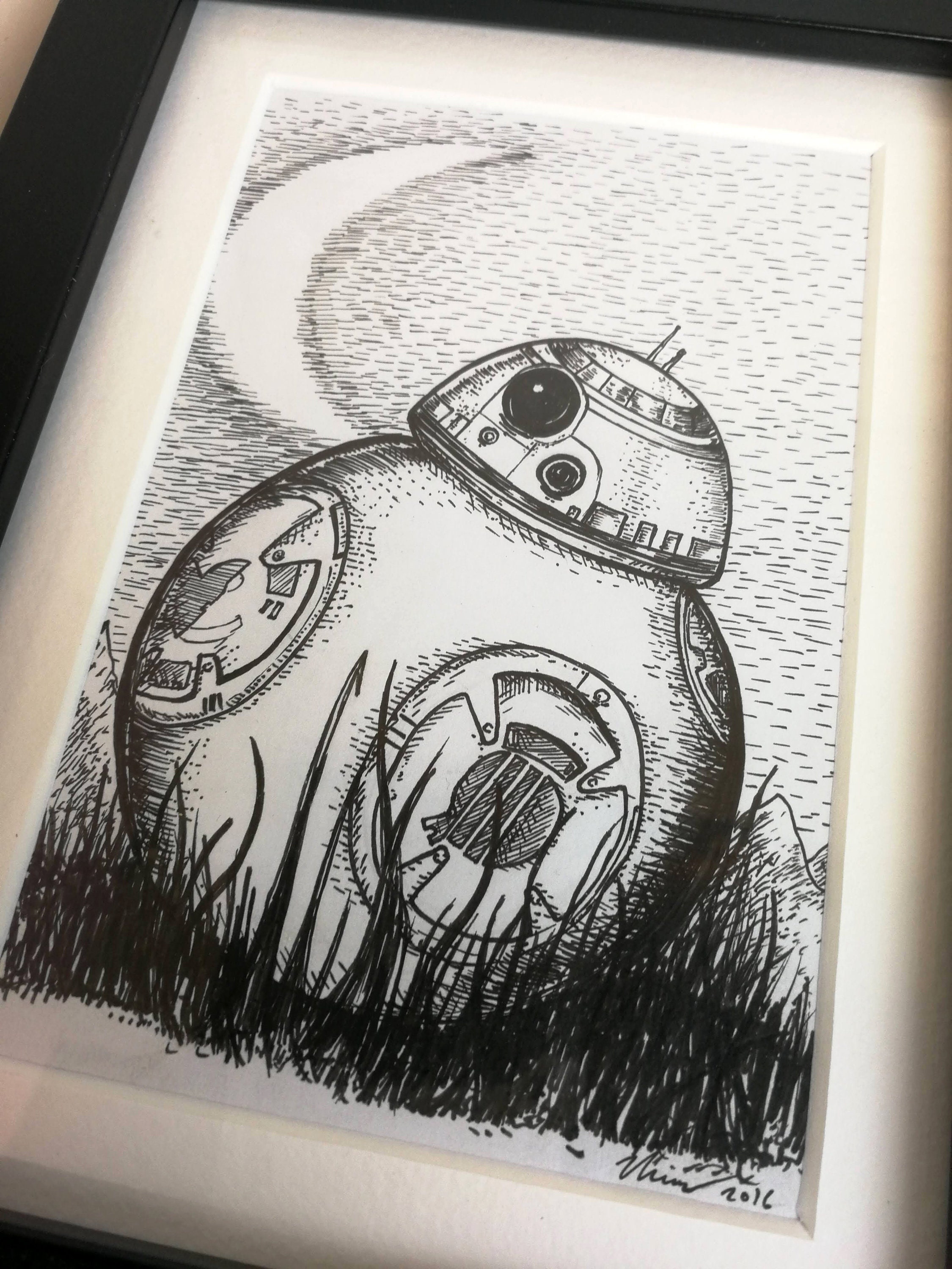 A little pen and ink drawing by Jon Turner inspired by the adorable BB-8. Signed. Drawn on white cartridge paper, mounted and framed in a matt black box frame. Drawing is approximately 4x6 inches in size, frame is a couple of inches larger on each side. Frame is freestanding or can be hung on a wall.