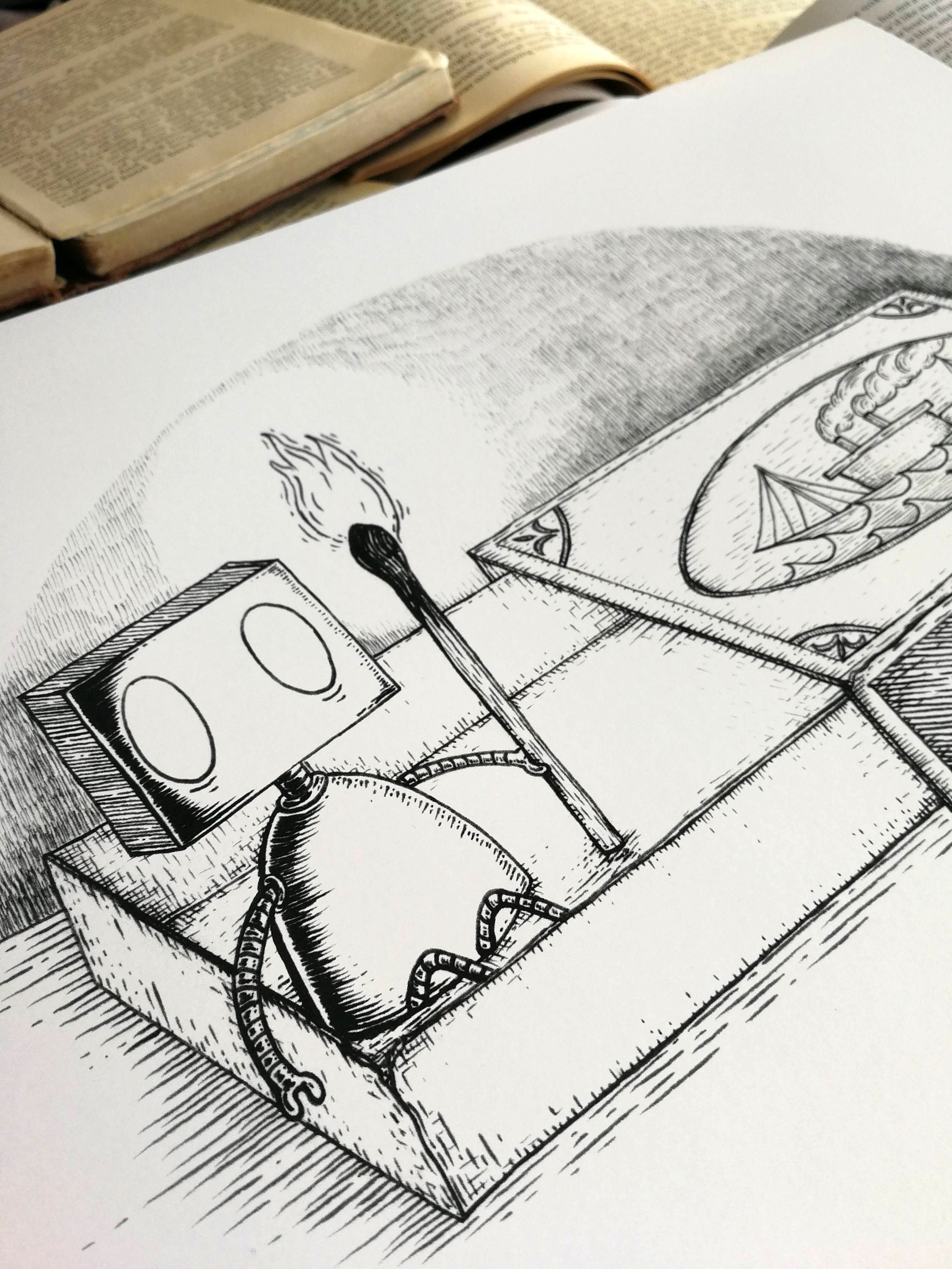 A print of a little robot keeping the home fires burning, from an original pen and ink drawing by Jon Turner.