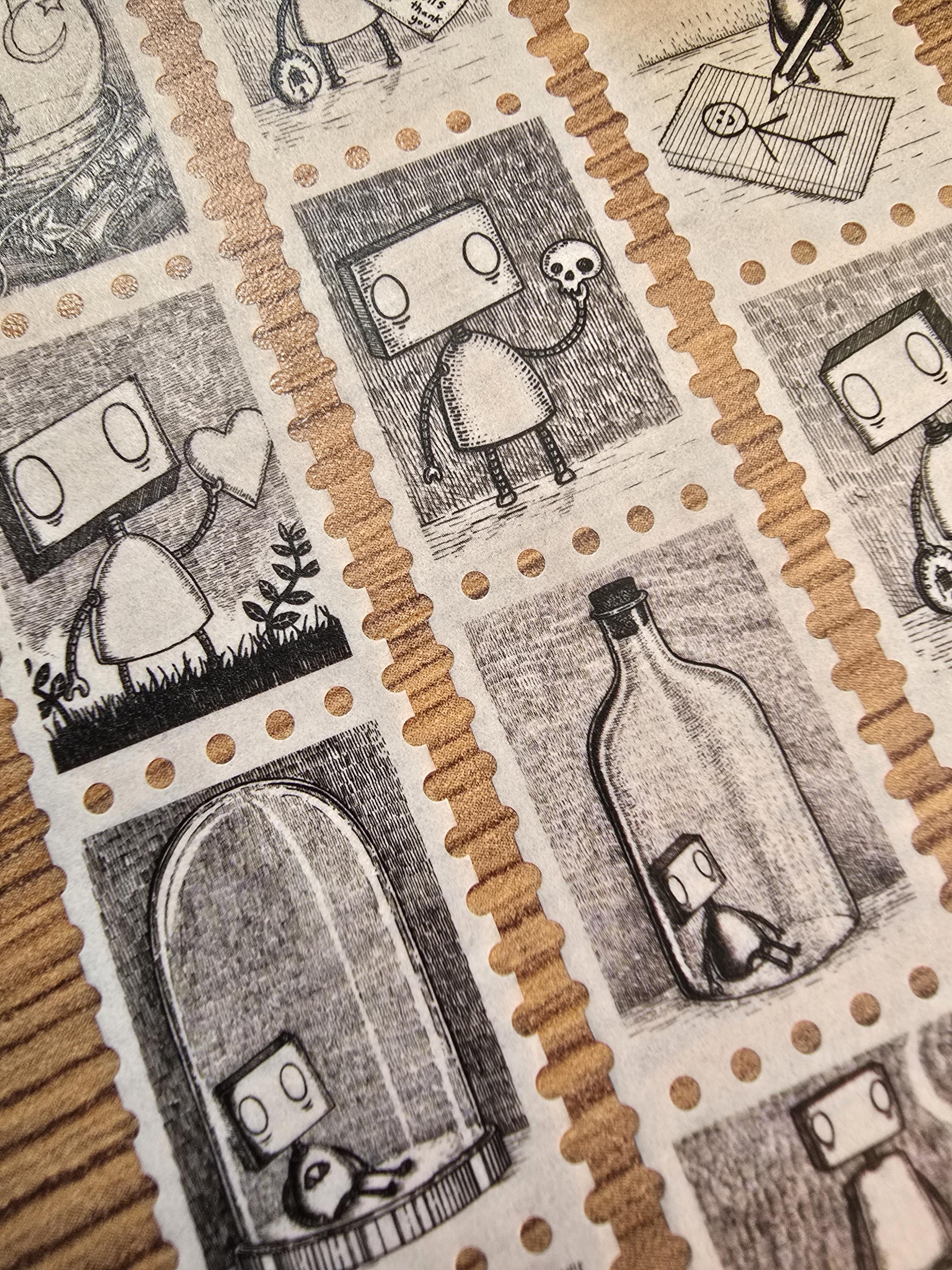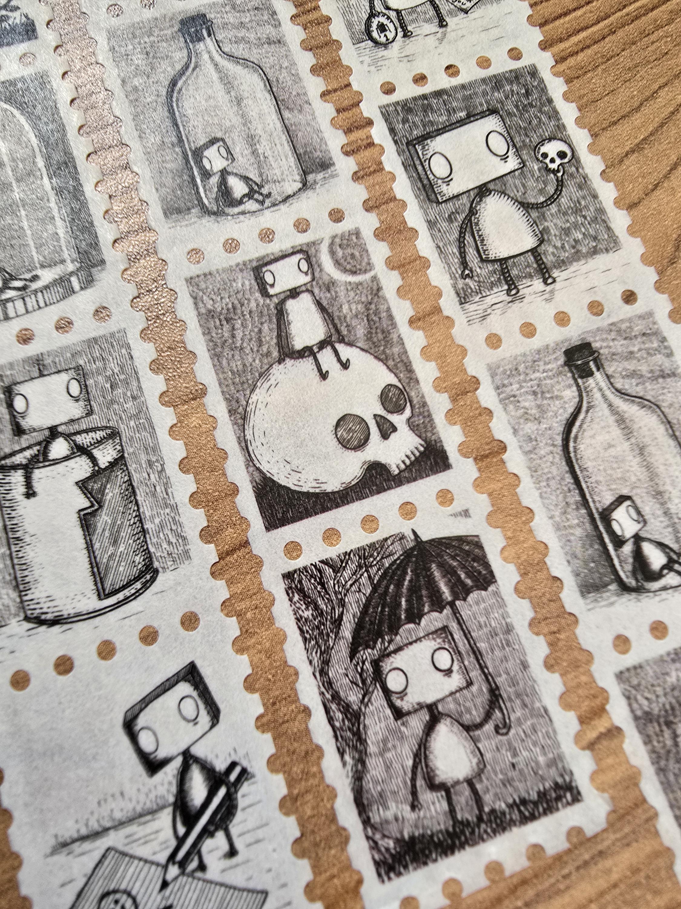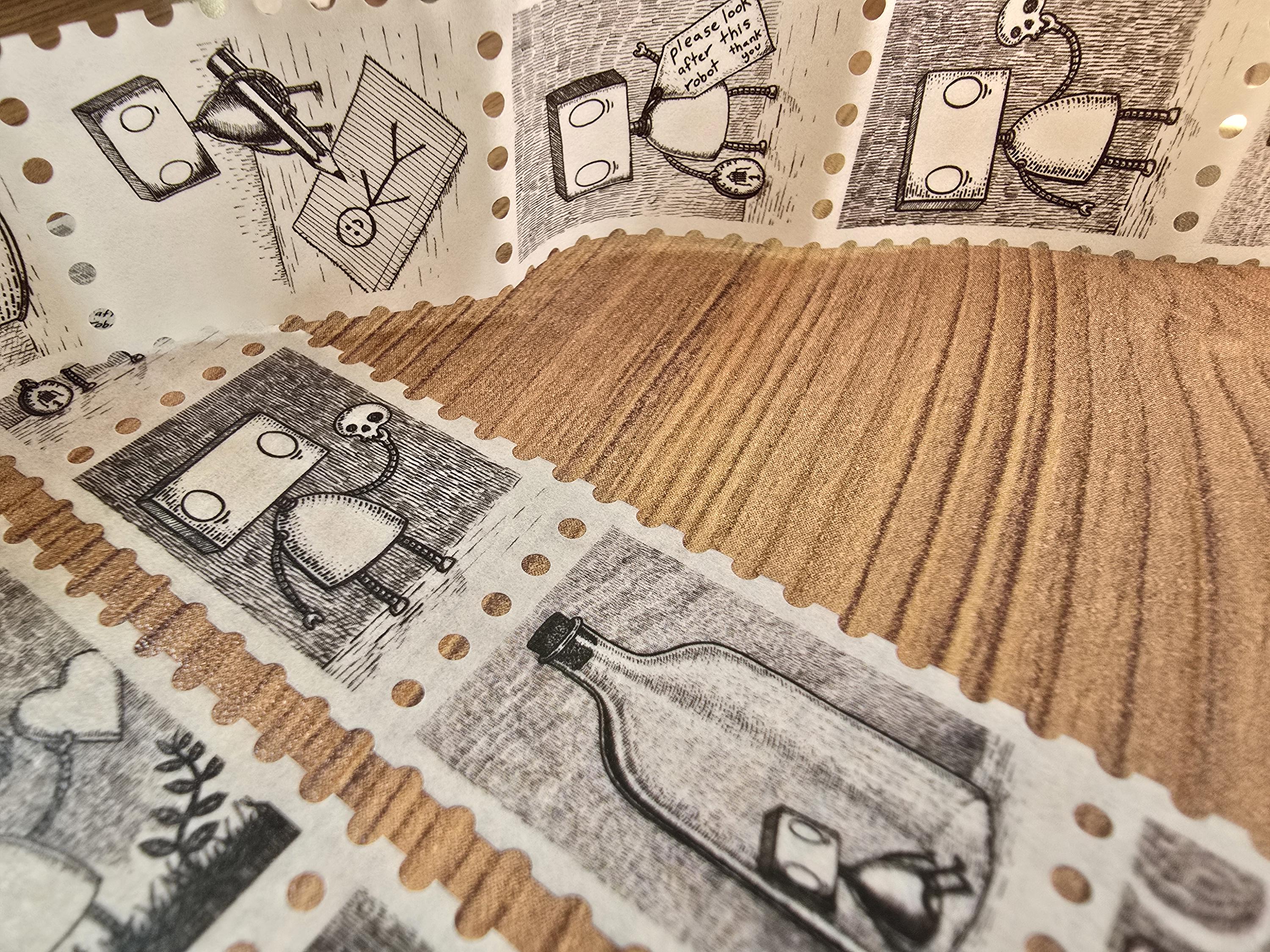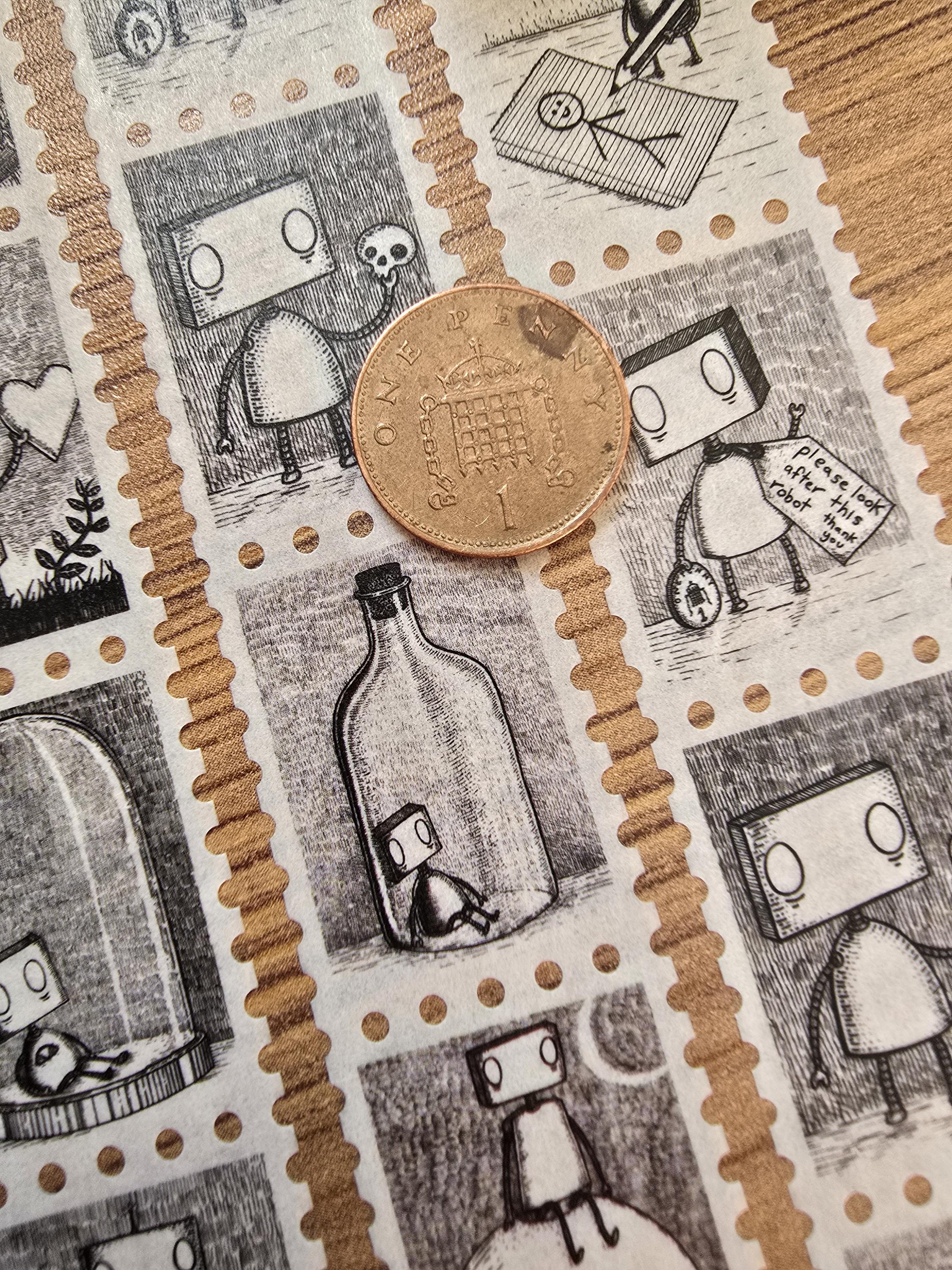 Everything is better with robots (probably), so now you can put melancholy little robots everywhere with this unique art washi tape. Perforated to look like a roll of postage stamps, this washi tape features a repeating pattern of ten designs in portrait format from hand-drawn pen and ink artwork by Jon Turner, recreated in incredible detail at miniature size. It can be applied like a tape, or cut into individual mini stickers; ideal for adding a finishing touch to envelopes, or for journalling and scrapbooking.
